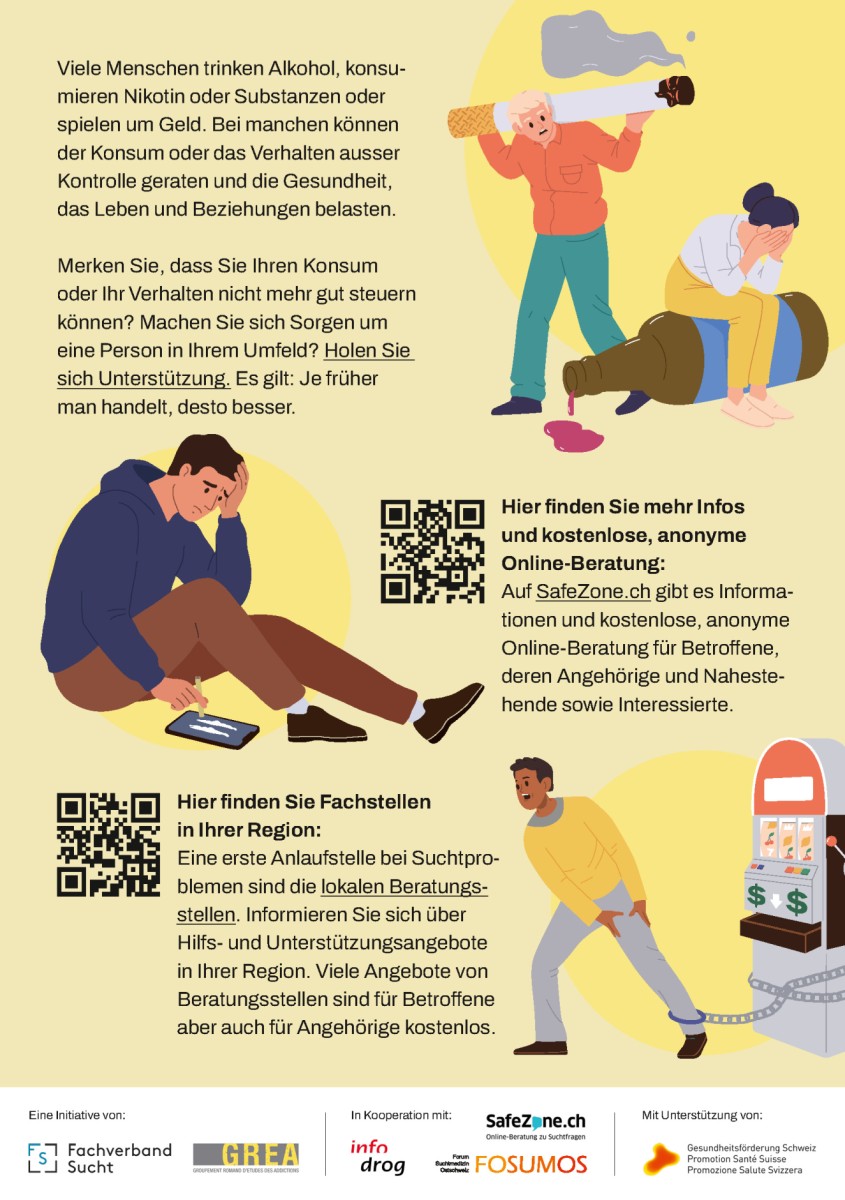 Sensibilisierungsflyer «Stress, Alkohol, Nikotin, Cannabis, Kokain, Geldspiele»