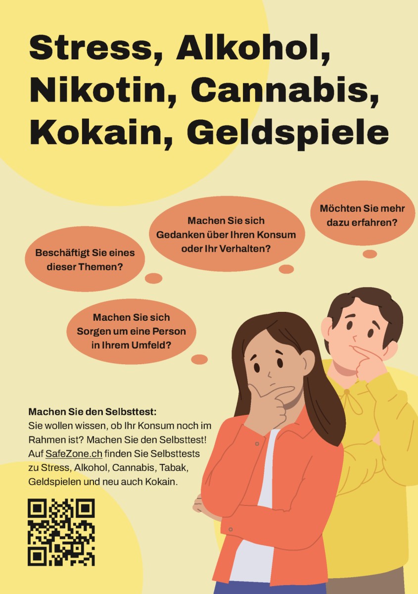 20.04.26 / SafeZone.ch bietet anonyme Online-Beratung und Selbsttests zu Alkohol, Cannabis, Tabak, Geldspielen und Stress. Neu ergänzt ein Selbsttest zu Kokain das Angebot. Er ermöglicht eine individuelle Einschätzung des eigenen Konsums.