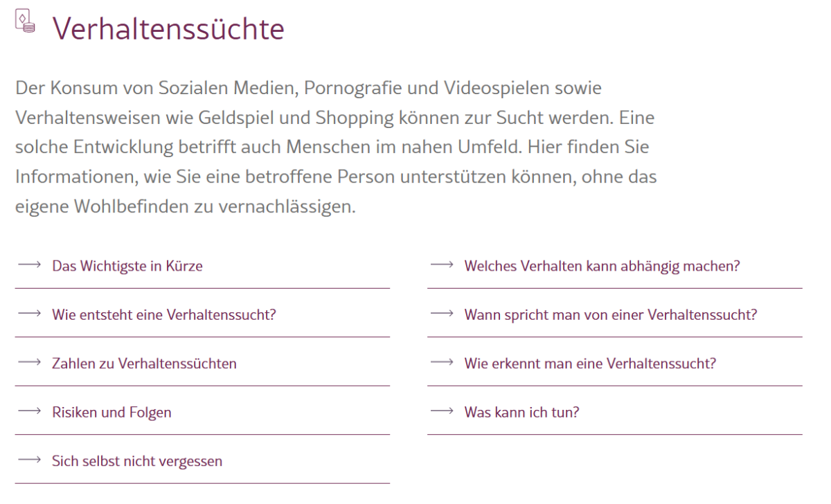 - Infos, wie man Verhaltenssüchte erkennt, und Empfehlungen, wie man ihnen vorbeugen kann
